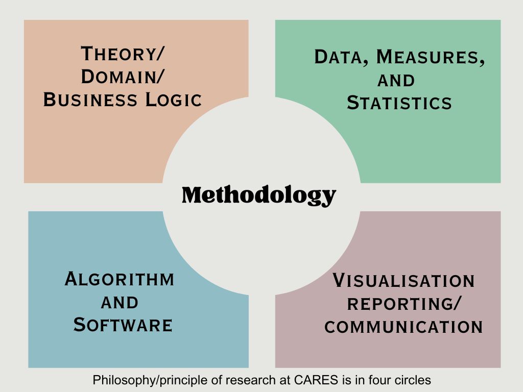 CARES adapts four circle principle of research which it has built over the years of experience. These four circles form the foundation of any research activity that are interconnected by the methodology to be followed. CARES adapts organic approach that enable the corporates, researchers, and students to incrementally grow. It provides the solutions to corporate problems. CARES helps to draw road map to researchers and corporates that enable them to systematically move forward in addressing any problem or issue.